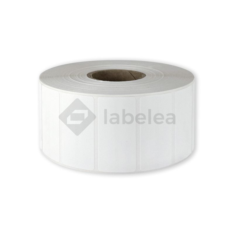 Selbstklebende Etiketten aus weißem Papier für den Druck in Thermotransferdruckern. Zum Drucken muss ein Farbband (Thermotransferband) verwendet werden.
