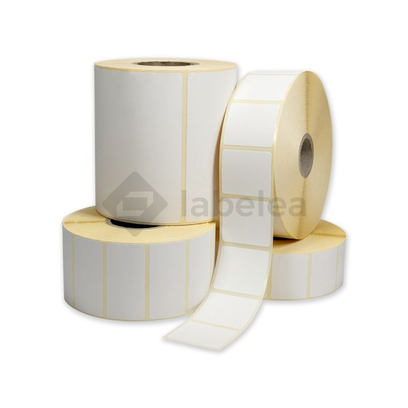 Fehér papír öntapadós címkék hőátviteli nyomtatáshoz. Kis tekercsre tekert címkék, legfeljebb 125 mm átmérőjű, asztali nyomtatókhoz alkalmasak.