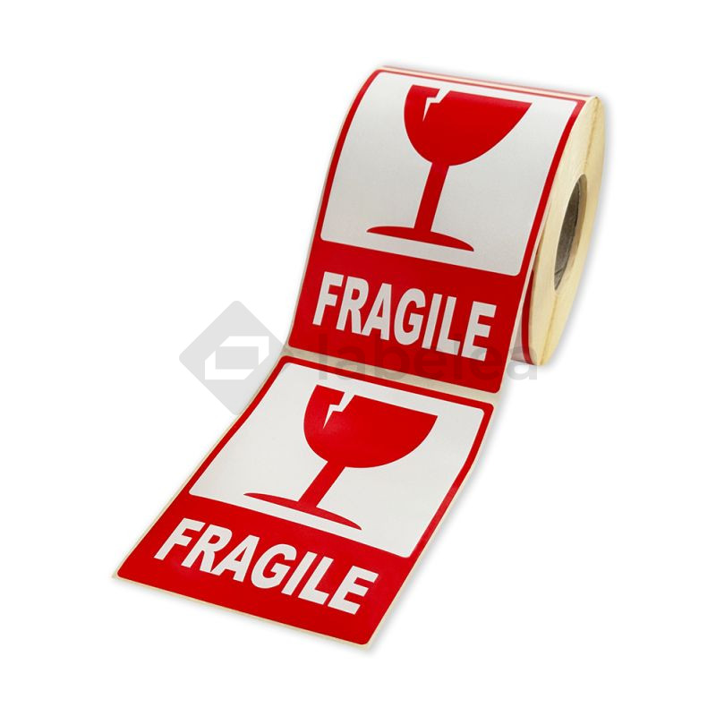 Papierowe samoprzylepne etykiety ostrzegawcze z czerwonym nadrukiem. Etykieta wskazuje delikatną zawartość.